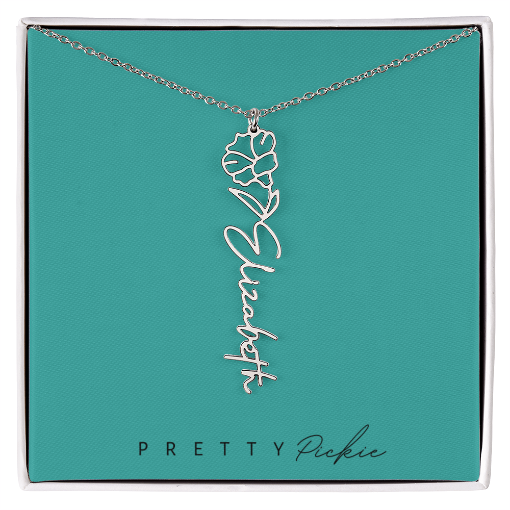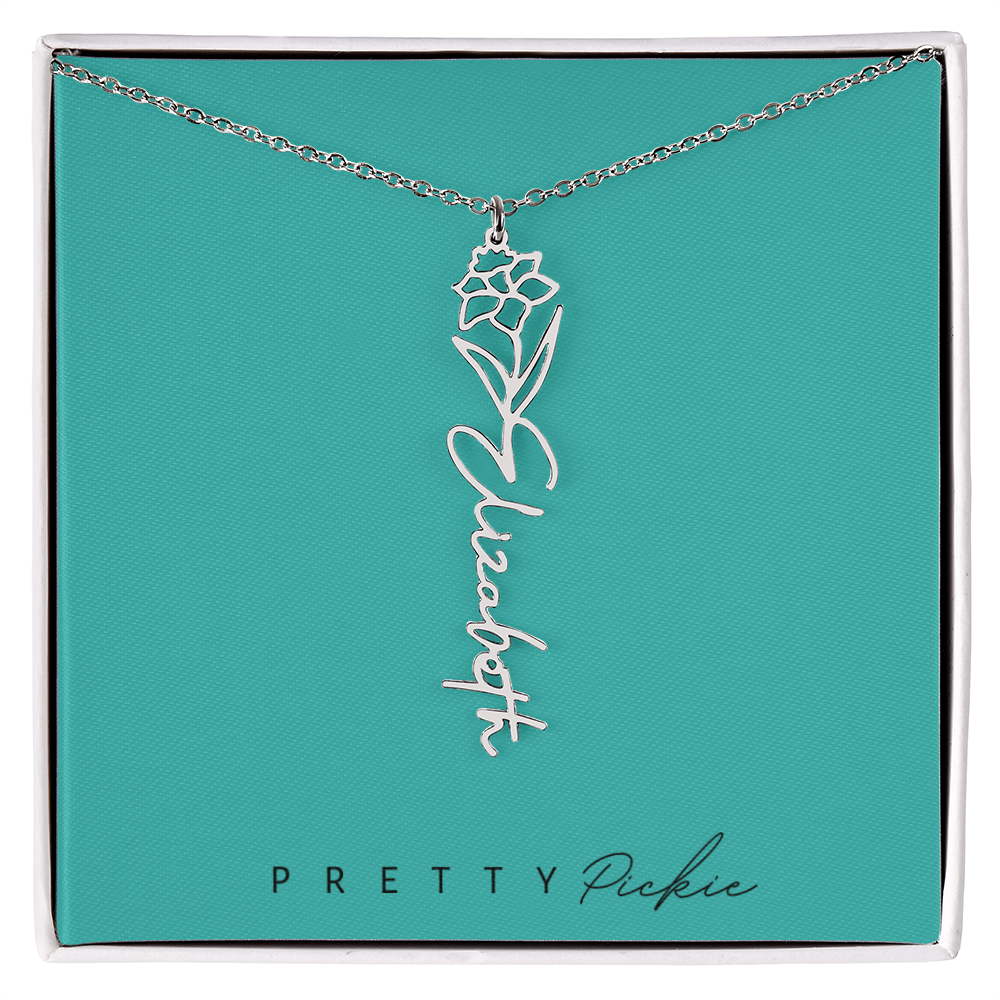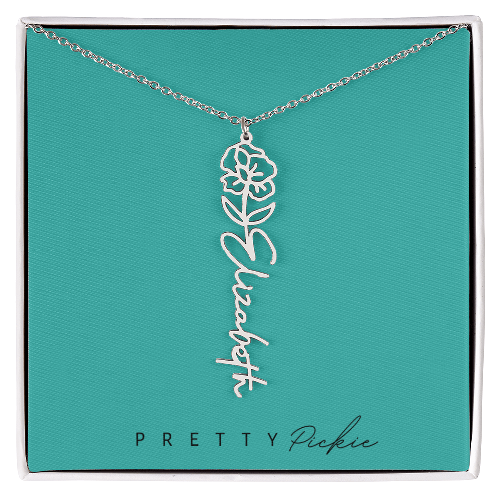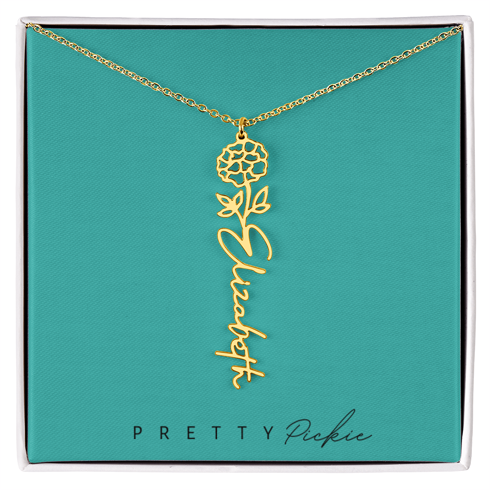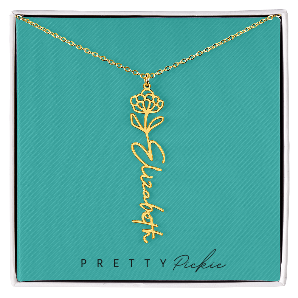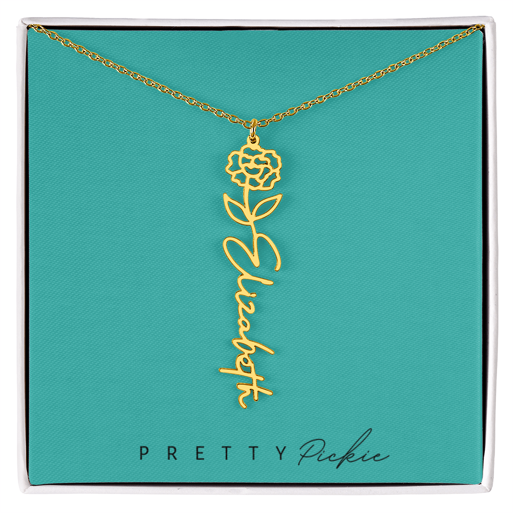 Este elegante collar presenta un nombre en cursiva colgado de una cadena tipo cable ajustable de 45 a 50 cm, ¡lo que lo hace tan personal como hermoso! Tu collar se personalizará al momento de realizar el pedido con el nombre o la palabra que elijas, con hasta 10 caracteres y la flor de nacimiento que elijas. ¡Un regalo que sin duda querrán guardar en su corazón para siempre!